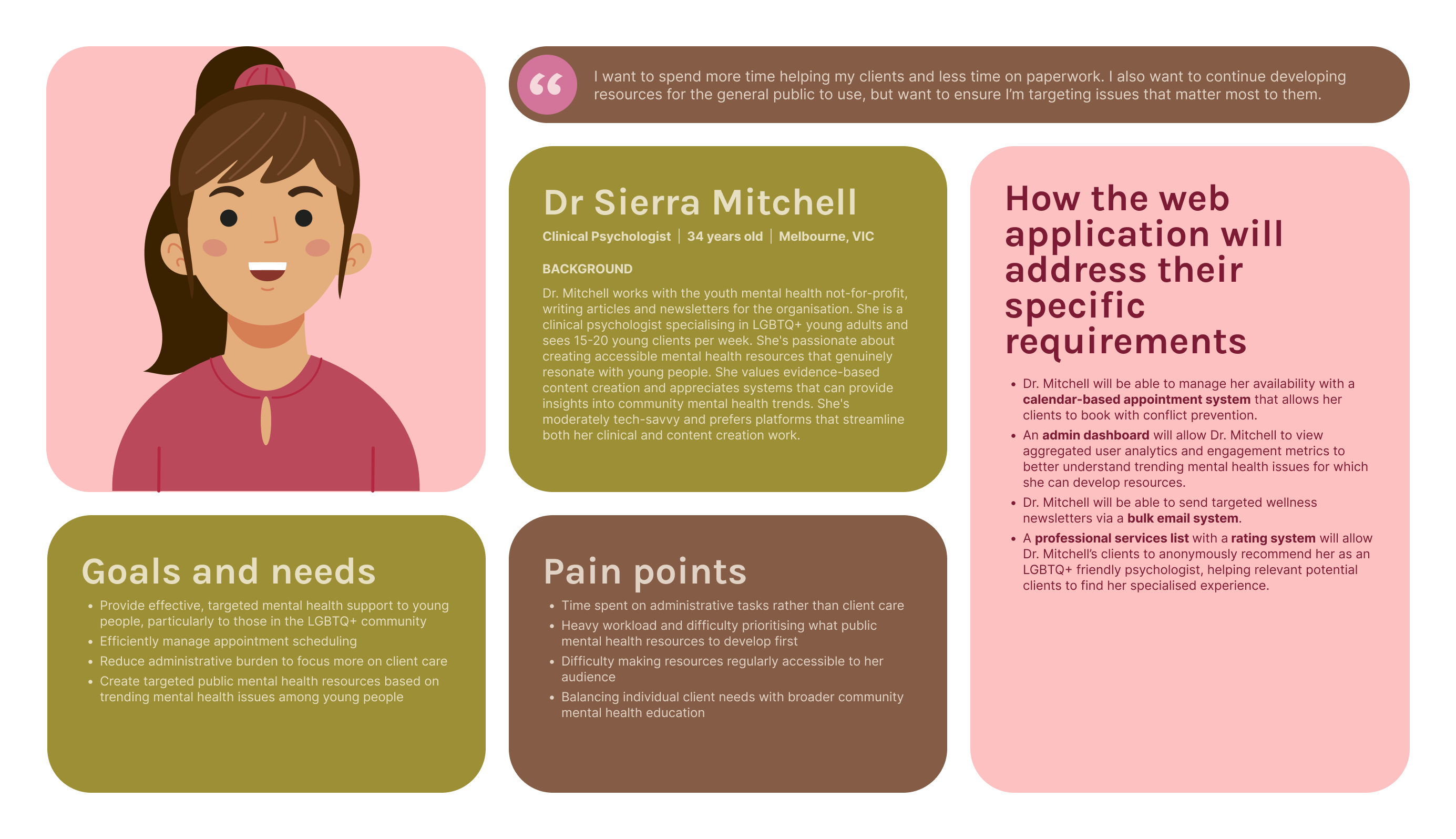 THRIVE Naarm is a fictional youth mental health and wellbeing not-for-profit organisation based in Melbourne. Partnering with local psychologists and psychiatrists, the organisation wishes to develop a comprehensive resource hub that will bridge the divide between online knowledge-bases and professional mental health services, targeted specifically towards tech-native, young-adult Melburnians aged 16-25.